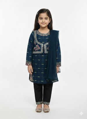 Girls' Embroidered 3-Piece Festive Eastern Suit with Koti Jacket and Net Dupatta