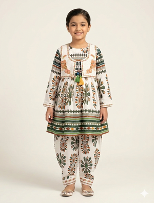 Girl's Ethnic Printed Cotton Kurta with Embroidered Waistcoat and Matching Tulip Shalwar Suit Set
