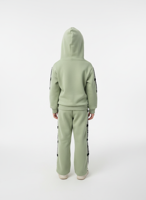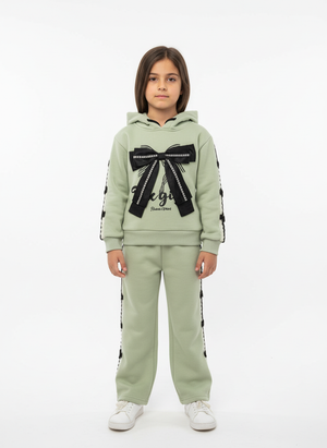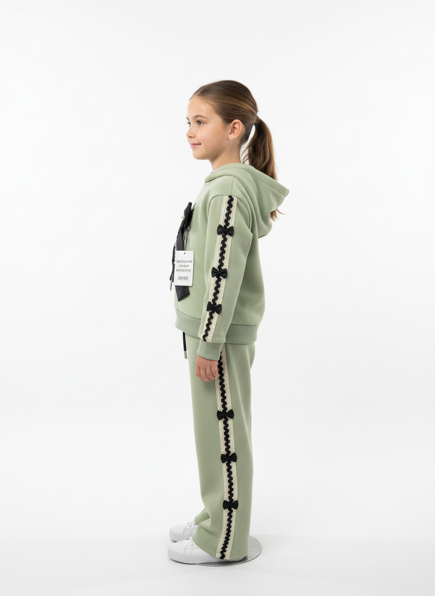 Girls Premium Bow Hoodie Tracksuit – Winter Fleece 2-Piece Set | Sizes 4–12 Years | Light Green & Light Pink | China Import