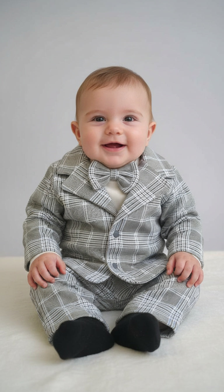 Give your baby a smart and stylish look with this Turkey Imported Baby 3-Piece Set, specially designed for 0 to 12 months. This classy outfit includes a cute coat, soft shirt, and matching trouser, finished with a charming bow tie for extra elegance.