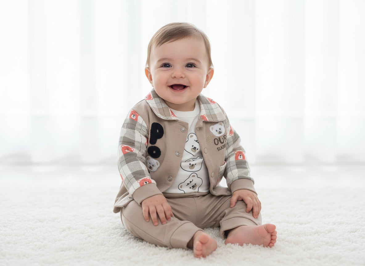 Keep your little one cozy and stylish with this Turkey-imported baby 3-piece set. Designed for 0โ12 months, the set includes a bodysuit, upper, and matching trousers. The cute bear design and a single pocket add a playful yet practical touch, making it perfect for everyday wear or special outings.